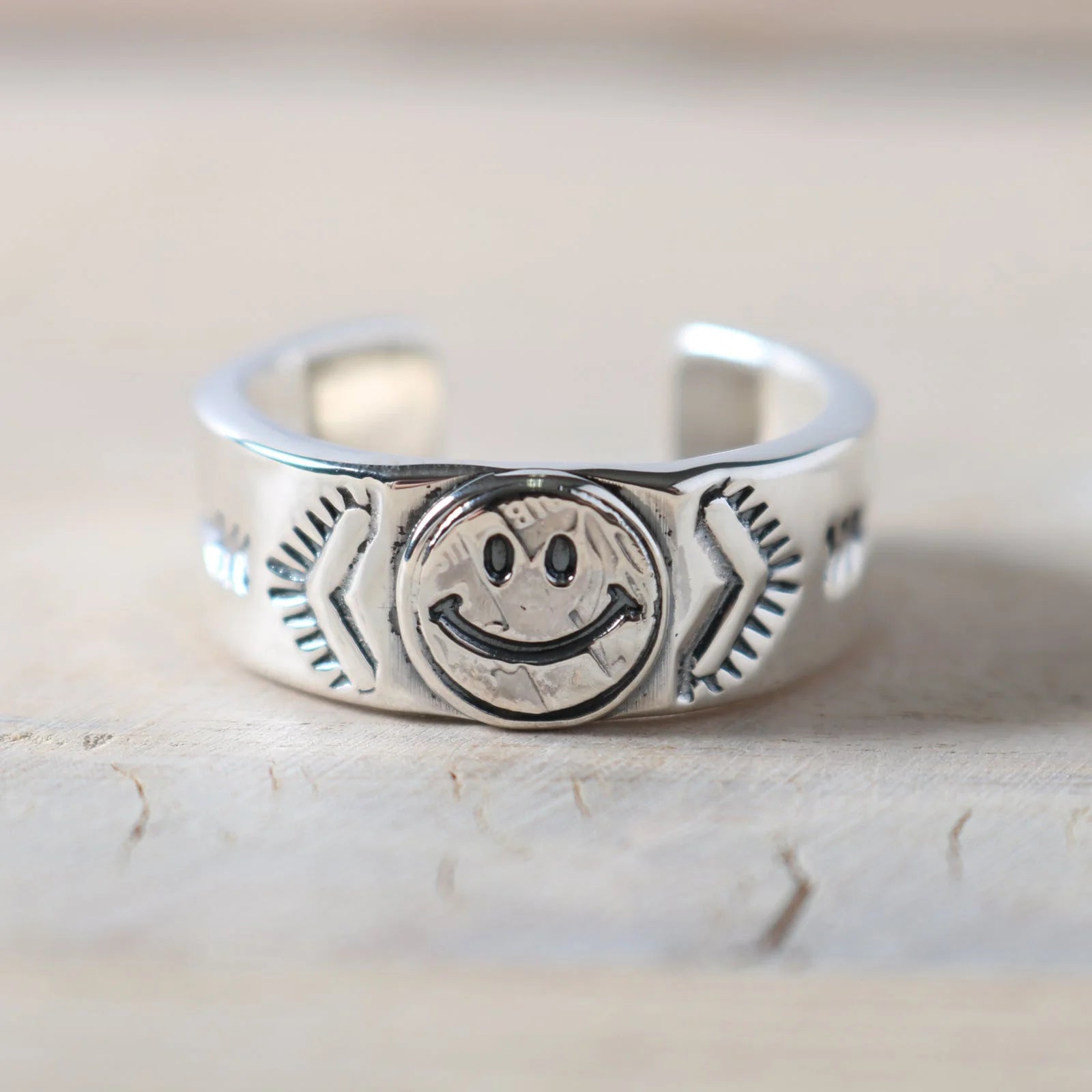 The city of Fussa in Tokyo, about 40 km from the center of the city, has a somewhat American atmosphere, partly due to the Yokota Air Base. NORTH WORKS is a workshop and atelier in a renovated U.S. military house, where they continue to create products with unchanging value based on basic designs. Each item is made by hand, so each piece has a slightly different face, which becomes the flavor of the item. The new collection for Fall/Winter 2025 features a special collaboration between BARNS OUTFITTERS and NORTH WORKS, highlighting the brand's iconic Smile motif. The Smile Collection was specially commissioned by BARNS OUTFITTERS and includes a series of accessories centered around the iconic smiling face. A C-type ring featuring distinctive stamp work encircling the iconic smile motif.